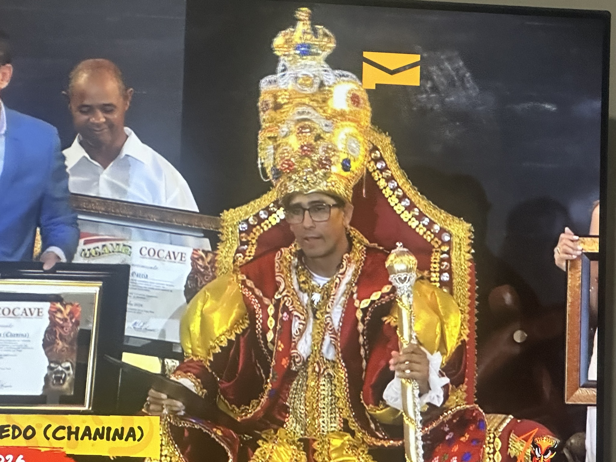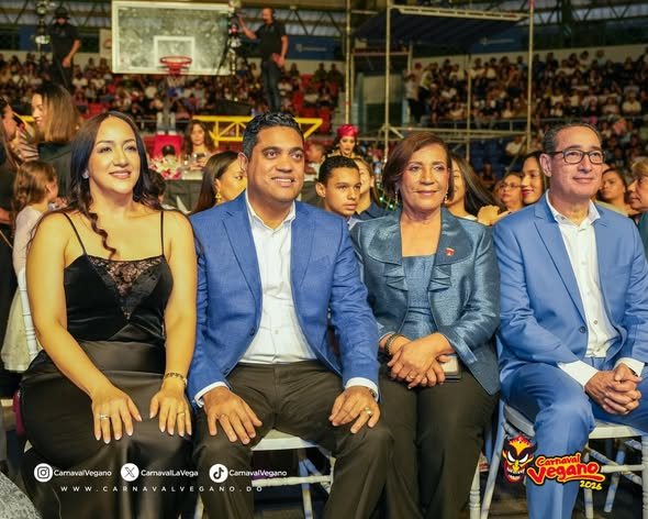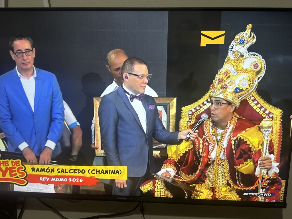 La presidenta del Comité Organizador del Carnaval Vegano (COCAVE), Amparo Custodio coronó al Rey del Carnaval Vegano 2026, Ramón Starling Salcedo (Chanina) en el Pabellón Fernando Teruel de La Vega.