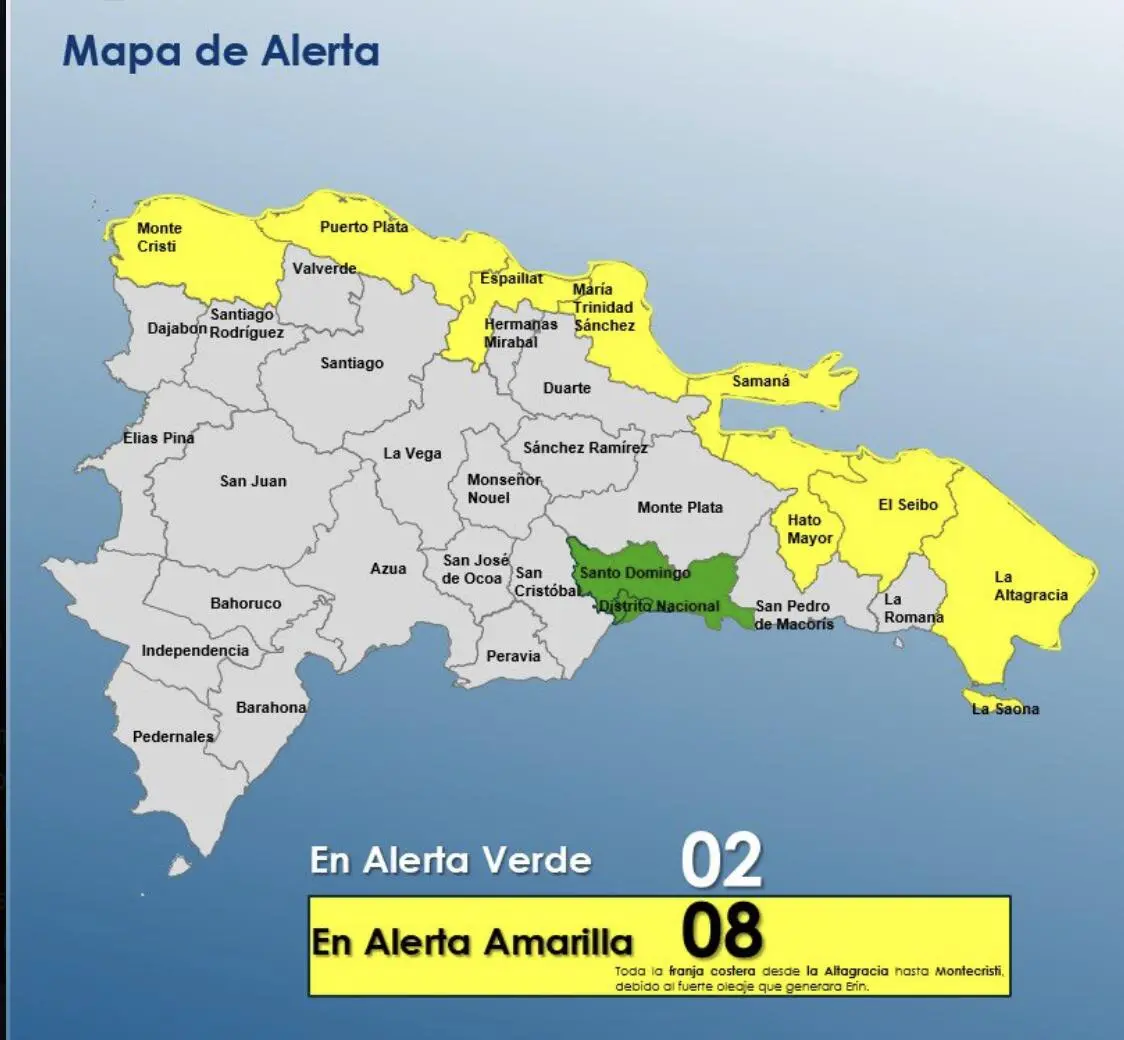 Santo Domingo, R.D. – El Centro de Operaciones de Emergencias (COE) informó este sábado que colocó ocho provincias en alerta amarilla, mientras que mantiene dos provincias y el Distrito Nacional en alerta verde. Esto, debido a los efectos asociados al huracán Erin, un poderoso ciclón de categoría 5.