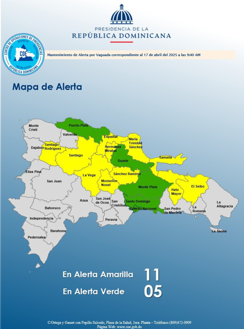 El Centro de Operaciones de Emergencias (COE) mantiene 11 provincias en alerta amarilla y mantiene cinco en verde, debido a que el informe del Instituto Dominicano de Meteorología (Indomet) establece que, para la tarde, se estarán presentando incrementos nubosos generadores de aguaceros localmente moderados a fuertes, acompañados de tormentas eléctricas y ráfagas de viento producto de una vaguada en diferentes niveles y los efectos del viento del este/sureste.